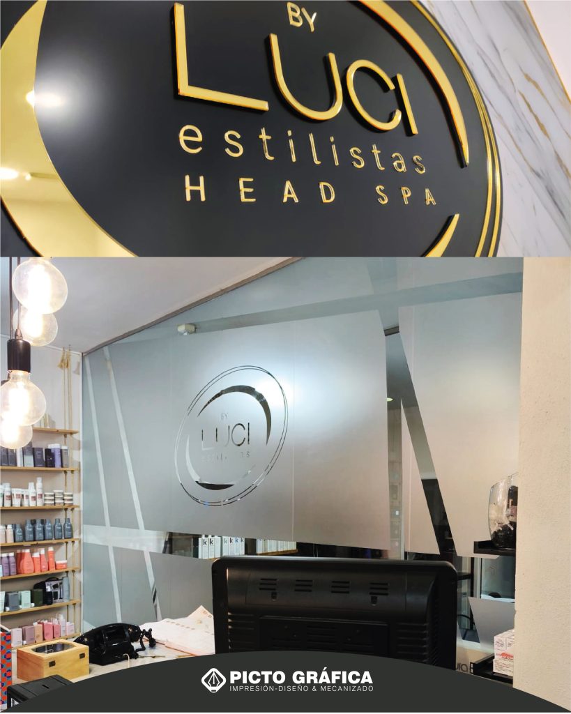 Los vidrios fueron decorados con vinilo arenado, en el que aplicamos el logo de LUCI ESTILISTAS mediante corte, ofreciendo un equilibrio perfecto entre privacidad y diseño sofisticado.