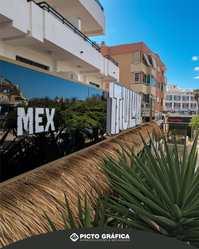 Las letras centrales TULUM se realizaron como letras corpóreas de 7 cm de volumen, pensadas para que el nombre del restaurante tenga una presencia clara y reconocible desde cualquier punto de vista. Para su fabricación utilizamos metacrilato, un material muy habitual en rotulación por su durabilidad y por cómo responde a la iluminación.