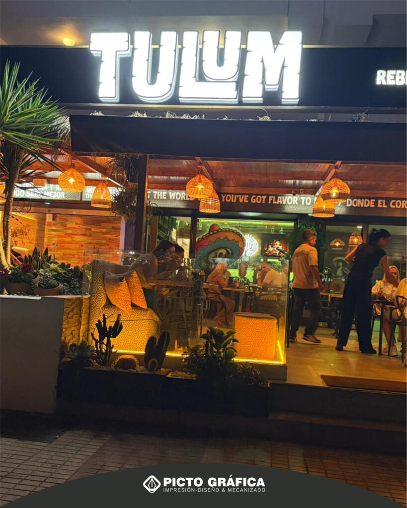 En el caso de Tulum – Rebel Mexican Food, el rótulo se diseñó teniendo en cuenta el entorno, la estética del local y el flujo constante de personas. La combinación de volumen, iluminación y materiales resistentes permite que el rótulo mantenga su impacto visual tanto de día como de noche.