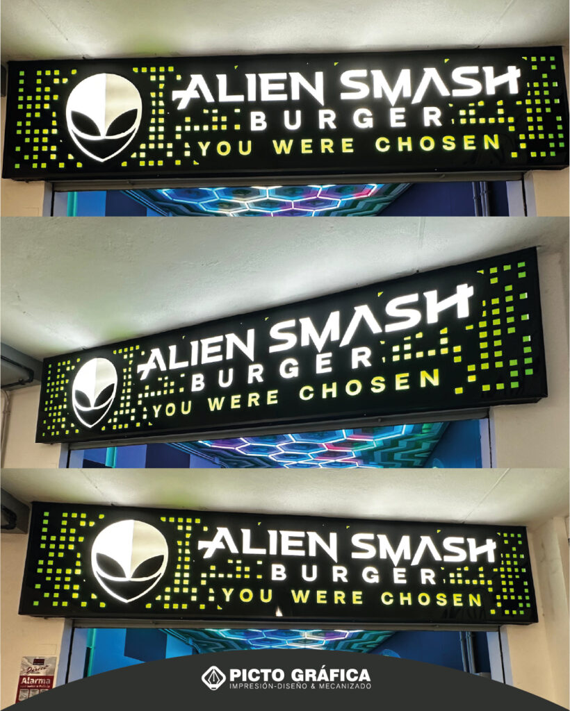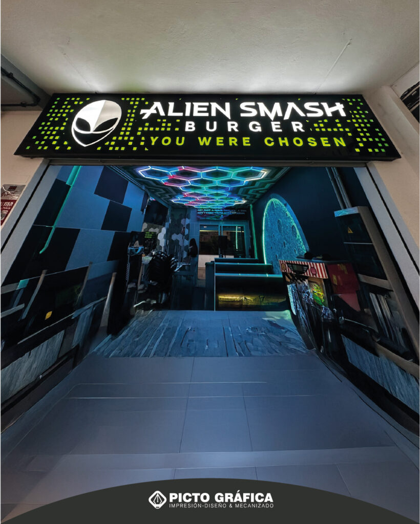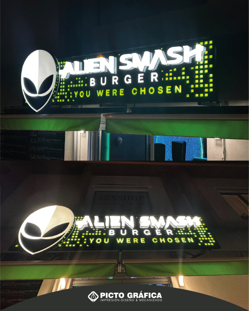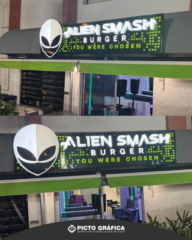 Dos rótulos luminosos coherentes entre sí, perfectamente adaptados a su entorno y alineados con la identidad de Alien Smash Burger. Un ejemplo de cómo la rotulación puede reforzar la visibilidad y la experiencia del cliente desde que entra al centro comercial hasta que llega al local.