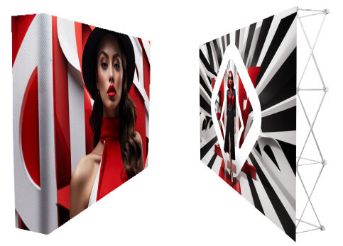 Este expositor pop-up tiene una estructura de aluminio plegable, lo que lo hace muy fácil de montar y desmontar. Es ideal para promociones de gran dimensión, photocalls en eventos y ferias, destacando en presentaciones y exposiciones.